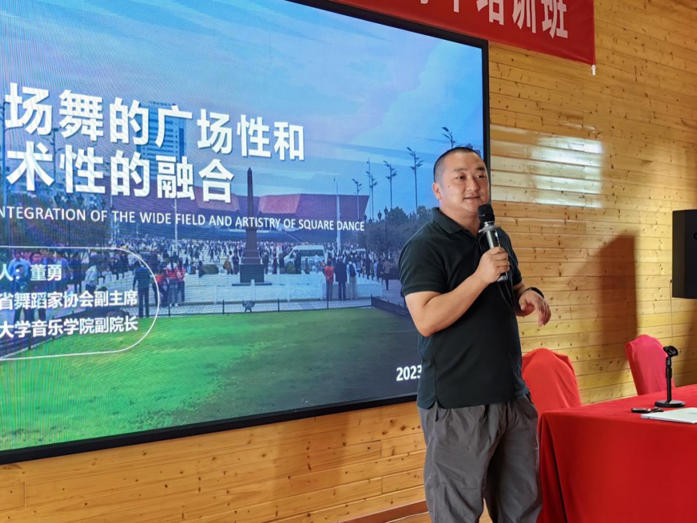 今天的培训由湖北省舞蹈家协会副主席、江汉大学音乐学院副院长---董勇教授授课。董教授作为武汉市“优秀青年教师”、湖北省文联中青年人才,已连续两届入选湖北省文化和旅游厅舞台人才重点培养项目,编导和指导过多个作品在国家级、省市级等相关舞蹈比赛中荣获嘉奖。