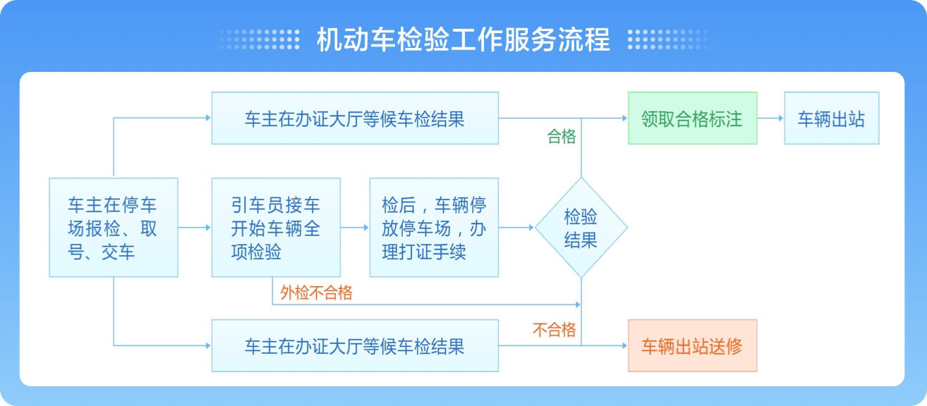 (1) 如果检验结果不合格,依据检验结果,对车辆进行修复复原,复检不合格的项目。(2)如果检验结果合格,归还行驶证,发放纸质年检合格证,车辆年检完成。