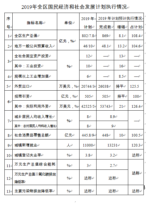 2020年全区经济社会发展主要目标预期如下:地区生产总值增长7.8%以上;地方一般公共预算收入增长10%左右;全社会固定资产投资增长10%左右;社会消费品零售总额增长8%左右;城乡居民人均可支配收入增长7.8%左右,其中,农村居民人均可支配收入增长8%左右;新增就业11000人;城镇登记失业率控制在3.8%以内;万元生产总值能耗降低率2.7%左右;万元生产总值二氧化碳排放降低率、主要污染物排放降低率达标。