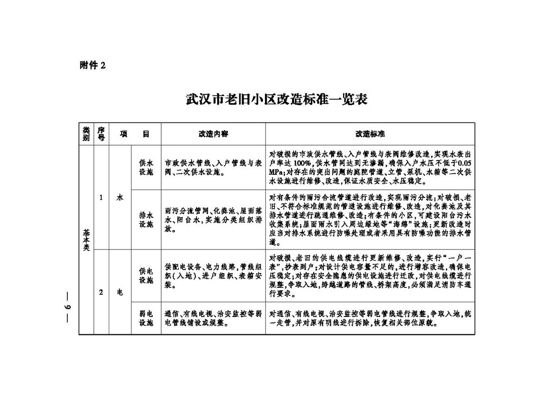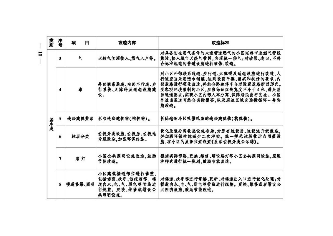1.基本类基础设施改造。含水、电(含通信)、气、道路、路灯、安防设施、消防设施改造和违法建筑整治、生活垃圾分类、楼道修缮(含楼道照明改造)、绿化美化等11项。