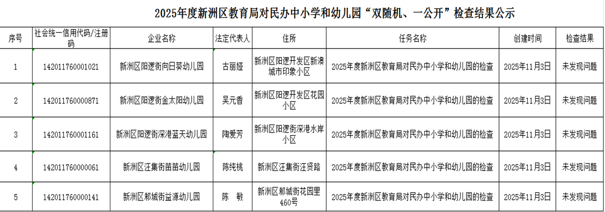 我局于2025年11月3日发起的对民办中小学和幼儿园的“双随机、一公开”工作任务,目前检查工作已结束,现将此次检查结果公示如下:(检查结果见附表)