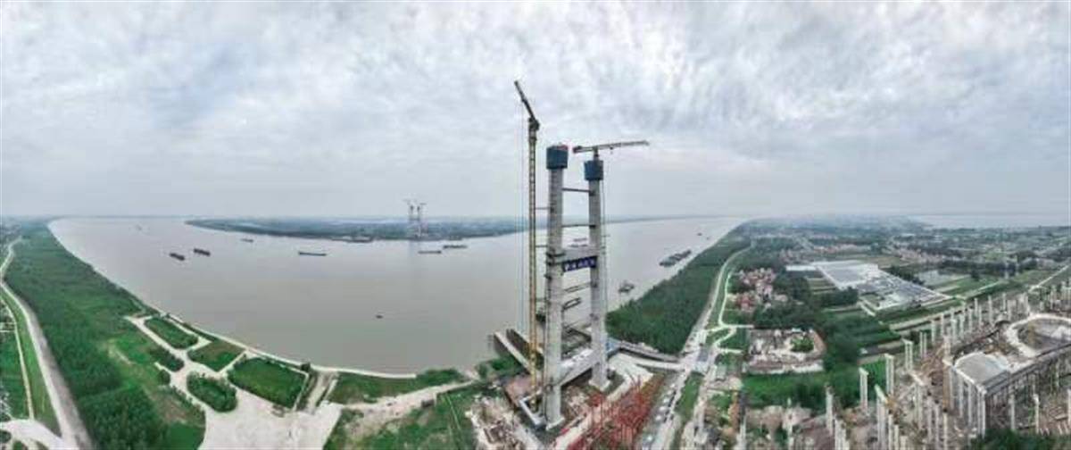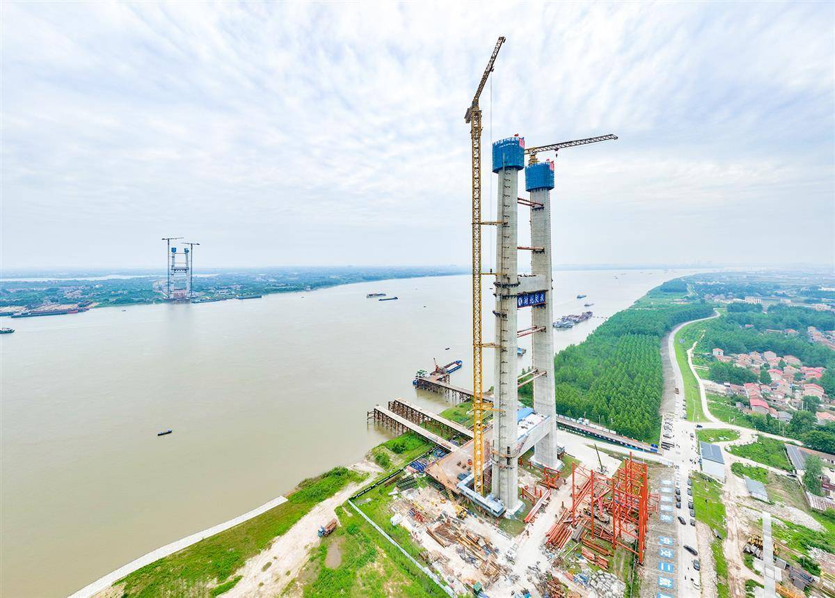 6月2日,武汉a片网 ,航拍双柳长江大桥北岸主塔。当天,随着双柳长江大桥北岸主塔最后一节塔柱混凝土浇筑完成,双柳长江大桥北岸主塔成功封顶,项目全线进入上部结构施工阶段。